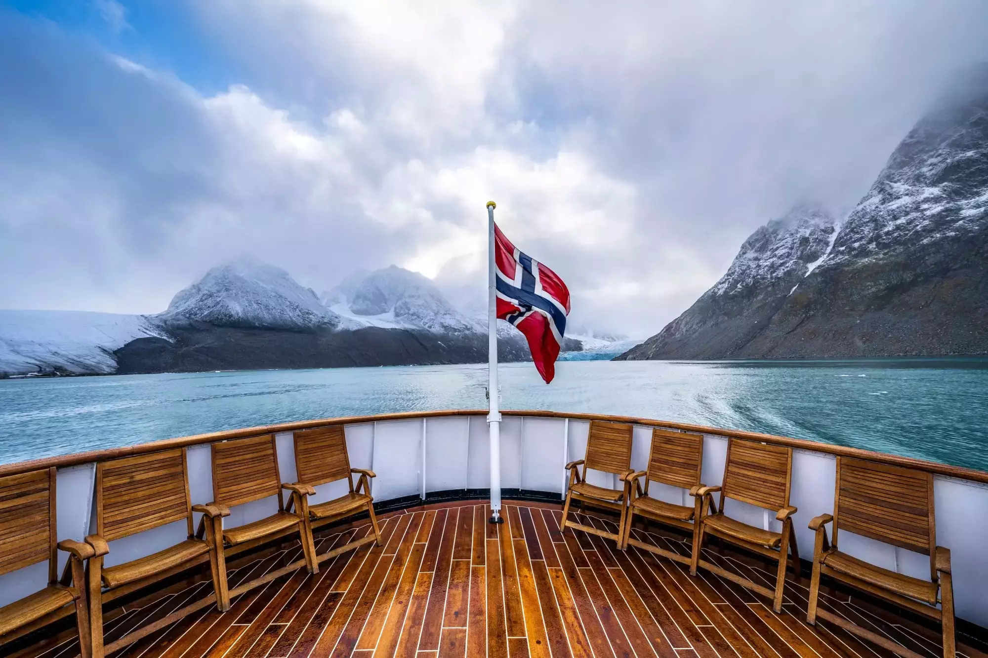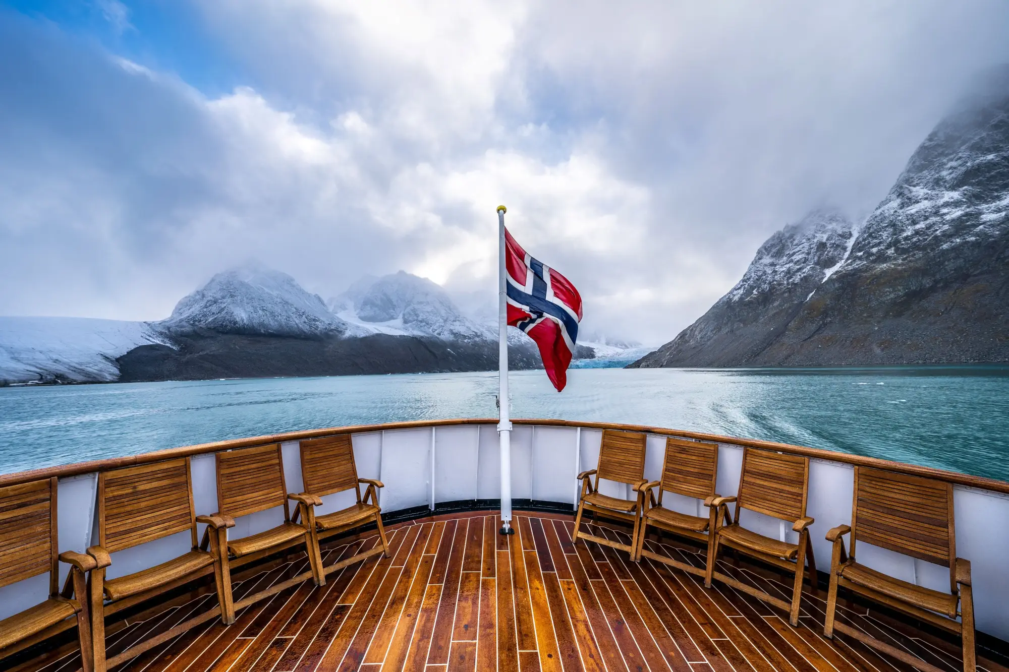 První noc byla těžká. Loď jela nonstop, vlny skoro žádné, ale spát se prostě nedalo. Ráno jsme vyšli na palubu a dýchla na nás nádhera – fjord zasypaný čerstvým sněhem, mezi mraky prosvítalo slunce, všude kolem hory s bílým popraškem. Zima se hlásila o slovo.